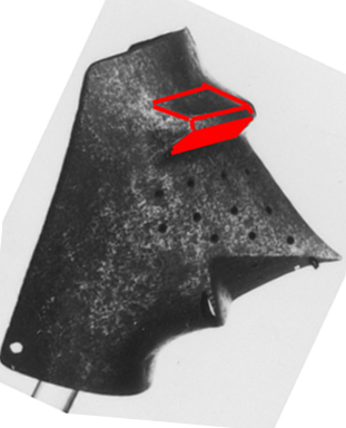 Видно, что шлем подвергся реставрации, либо вторичному использованию - надставлена пластина по лицевому вырезу, но по ней вновь прошиты отверстия для скоб авентайла и подшлемника.