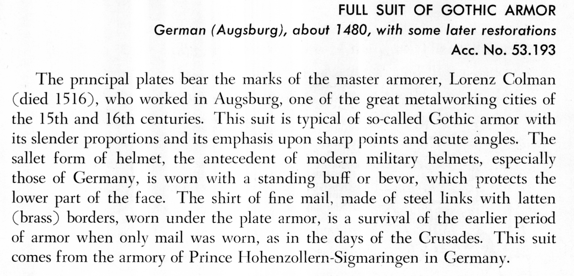 De Souzy приобрёл доспехи у пожилой Французской женщины, которой семейство купило комплект у Британского морского торговца в 1760 году.