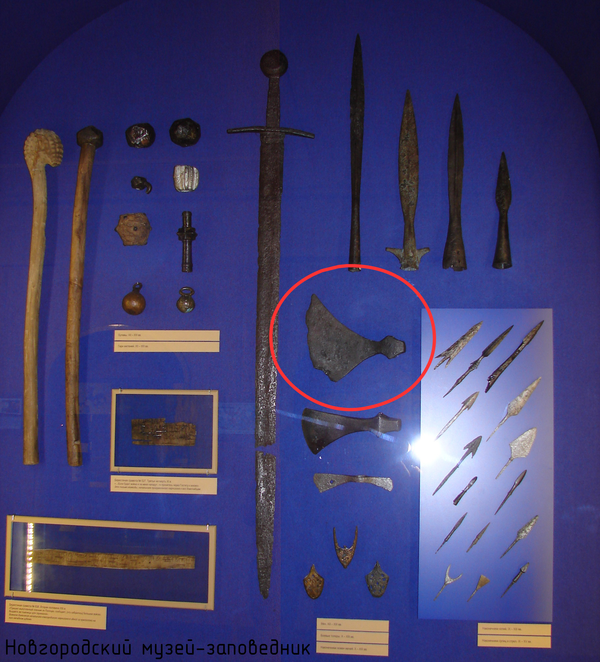 Вот, например (на этот раз действительно), типично скандинавский топор из Новгорода, выставленный в витрине юбилейной выставки в Новгродском музее-заповеднике: