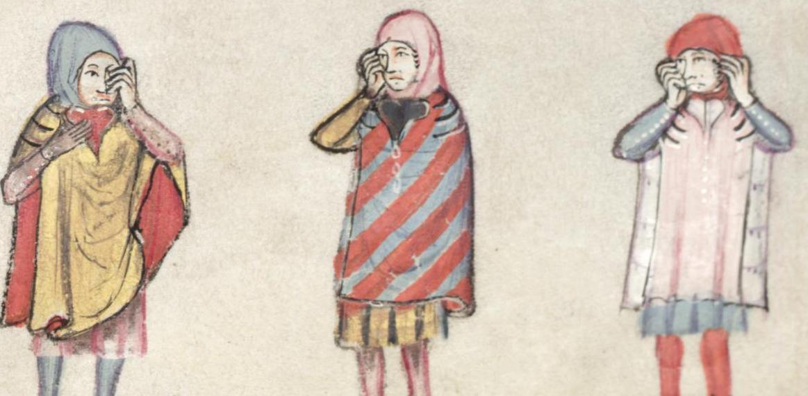 ИМХО изображены плащи, с застежкой (шнуровкой) на плече. На груди видны лацканы.У среднего персонажа под лацканами нечто. напоминающее пуговицы. Три поперечные полоски на плечах (застежки/шнуровки). Средний плащ примечателен еще своей расцветкой.