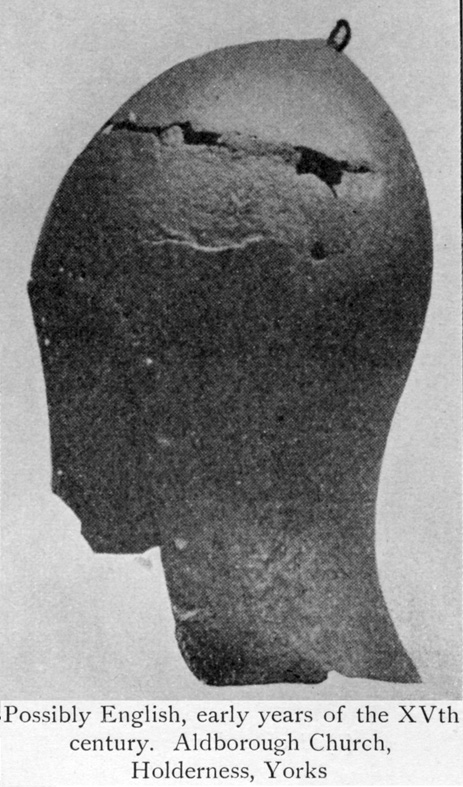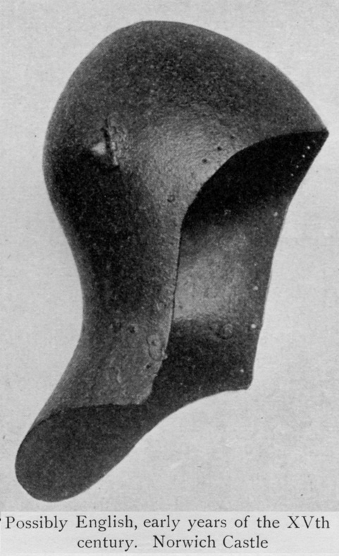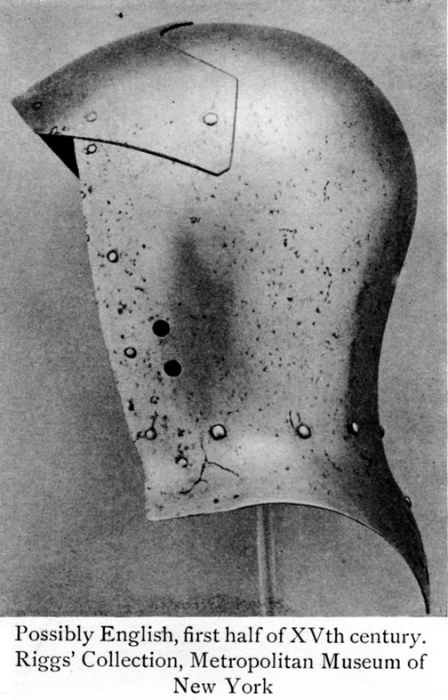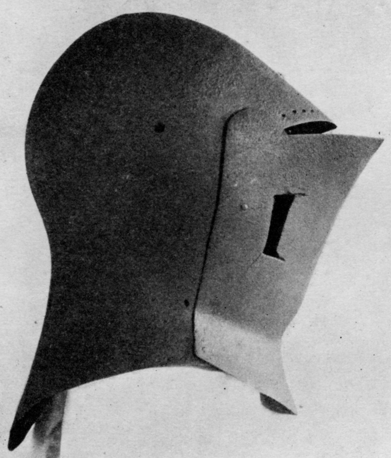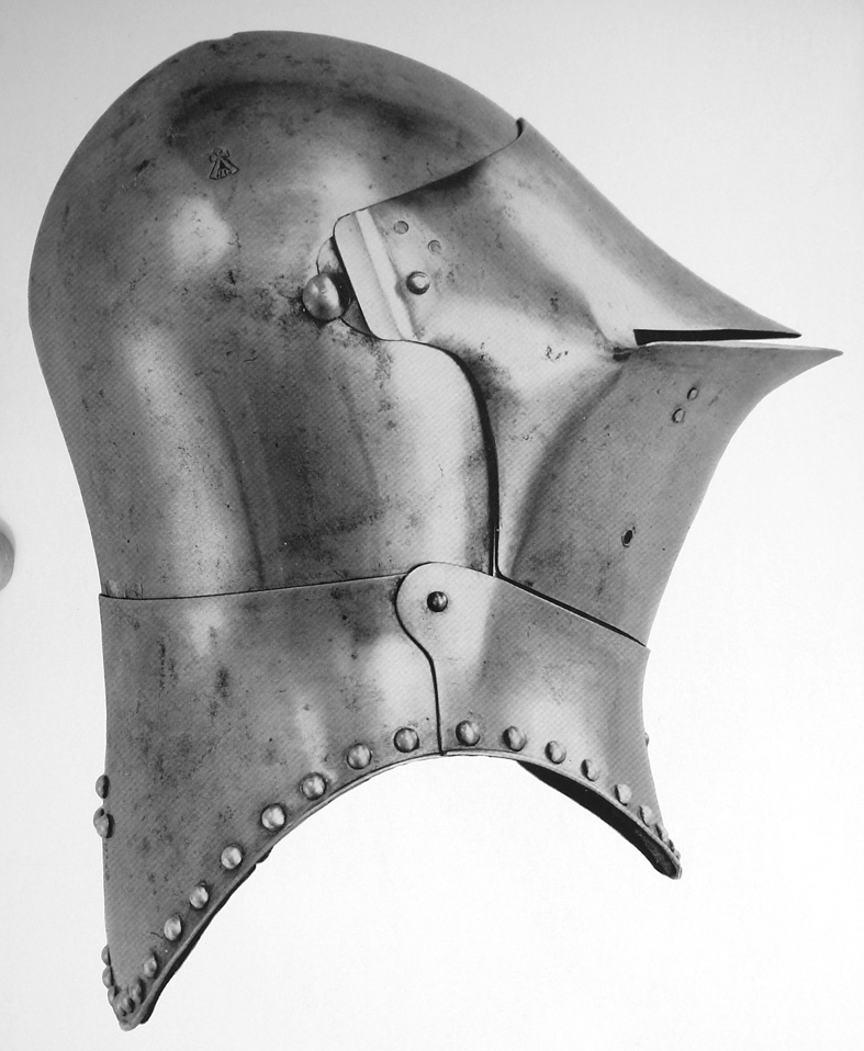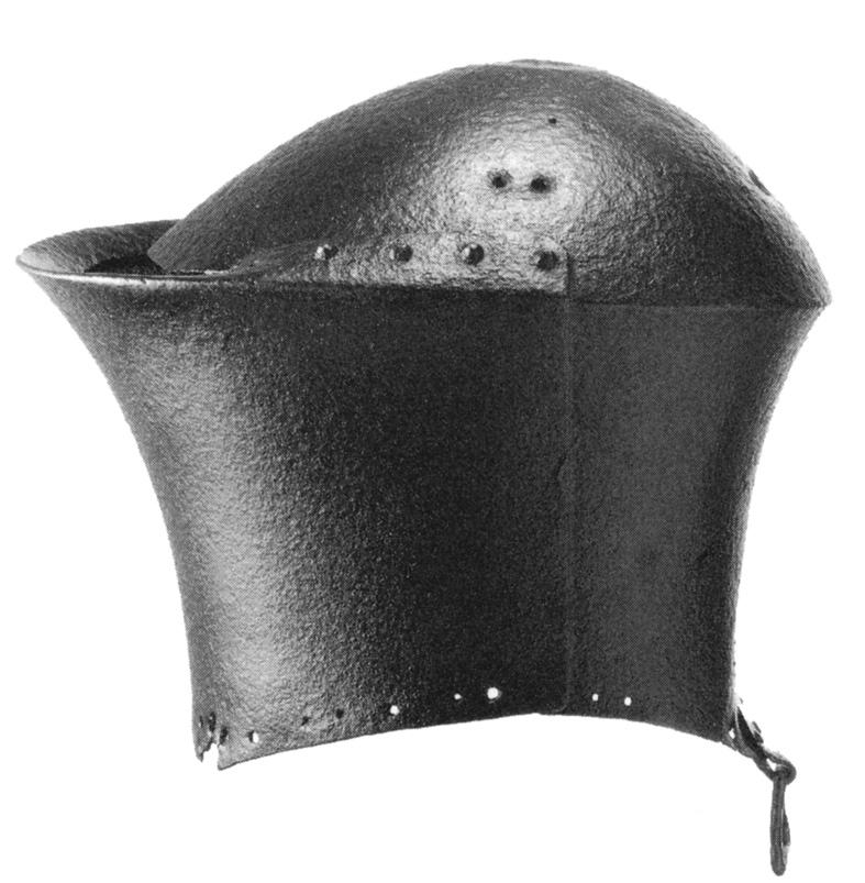 Другой вариант - при сохранении традиционной формы купола и тыльной части, уже не подбородочная пластина, а забрало приняло характерный выгнутый вид. Под рукой нет более ранних образцов, но в общем, для иллюстрации подойдет и грандбацинет из Хурбурга.