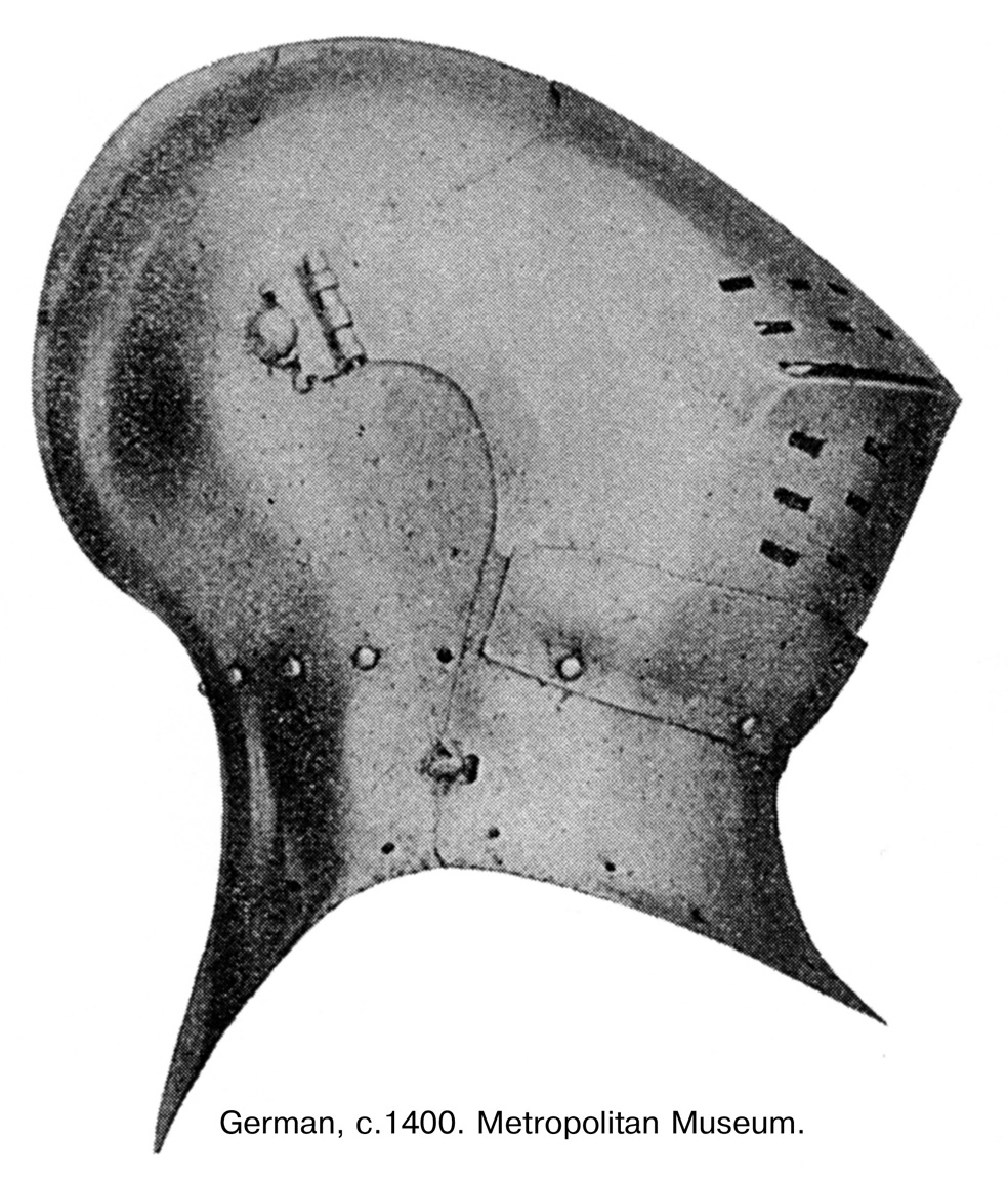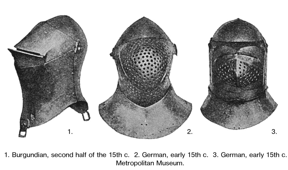 Господа! Возможно, кто-то поможет...Очень интересуюсь большими шлемами: топфхельмами, "жабьими мордами", грандбацинетами именно первой трети 15 века(с 1400 до 1430 г.), именно немецкого производства и именно артефактами.