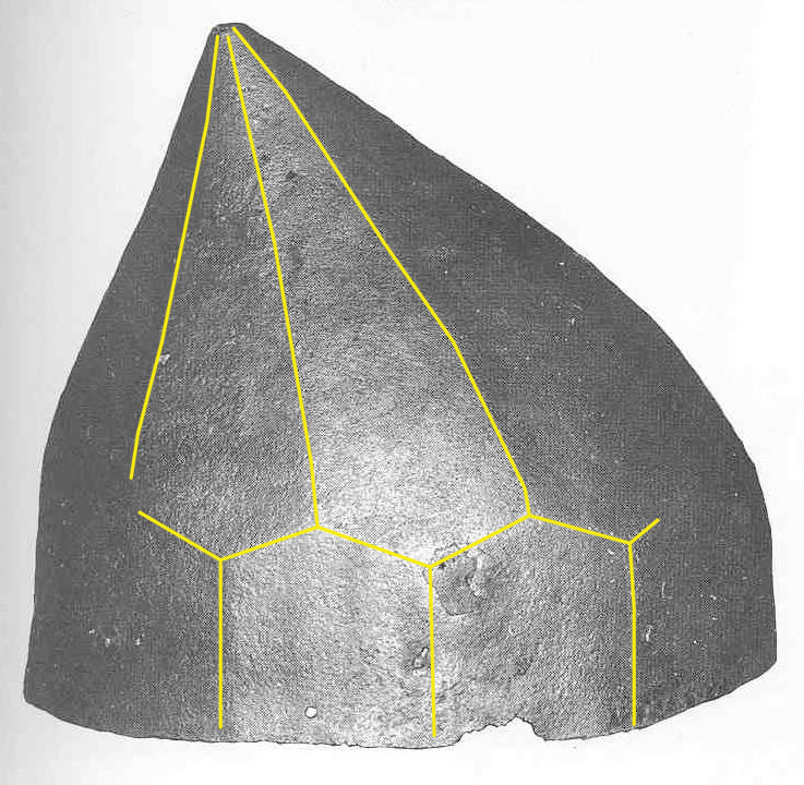 Это поздняя вещь, и не какого наклона там нет, это неудачный ракурс фотографии…Есть похожий на него шлем. Найден в Луцке. Датируется 14-15 веком. К сожалению, данных о публикации у меня нету.