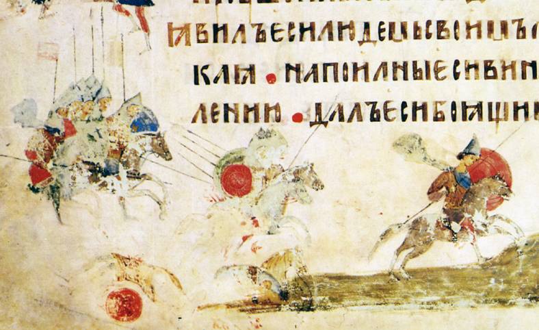 Мне встречались в интернете попытки народа притянуть изображение из русских летописей к этому шлему, вроде этих(на переднем всаднике), но скорее всего на всаднике обычный для Руси шлем, а его загнутое назад навершие можно оставить на совести изографа, который рисовал это.