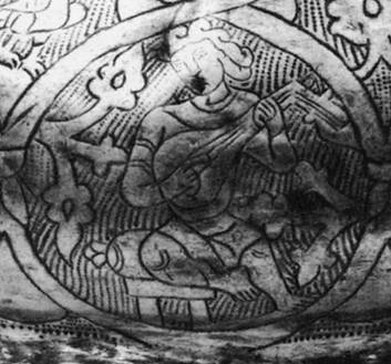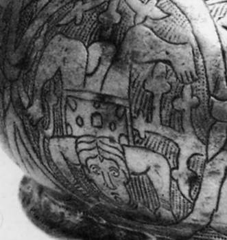 Крышка серебряной чаши с изображением актеров.