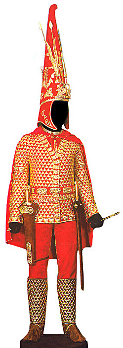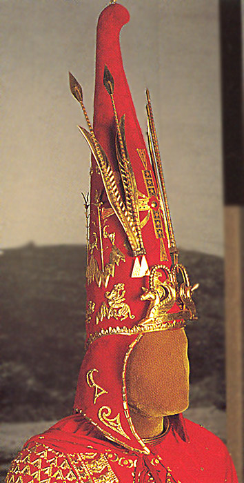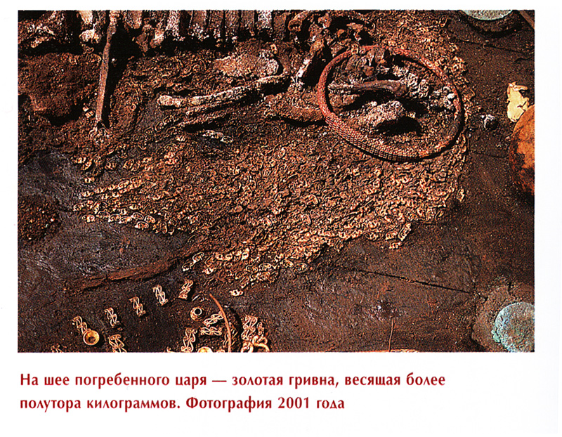 Не смог пока найти реконструкцию вождя из Аржана-2, только вот такую фотографию расположения нашивных бляшек и гривны.