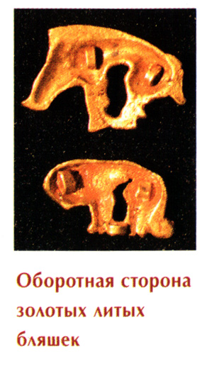 В отличии от штампованых сакских бляшек, нашивные бляшки из Аржана - литые, с кольцами для пришивания на обратной стороне, несотря на миниатюрные размеры (пантера в высоту около 1 см)